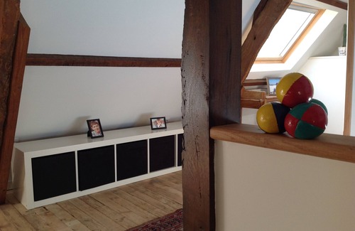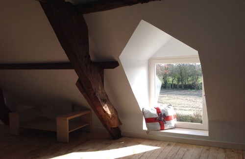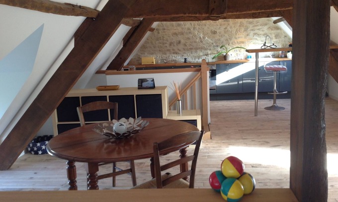 The studio is located within our property with an independent entrance open to the garden. The door opens onto an entrance of about 10 m2. A beautiful oak staircase leads you to the 1st floor. On the left of the stairs, the kitchen with fridge, dishwasher, oven and hob is open to the living room. 2 large roof windows illuminate the ensemble in addition to 2 skylights. The beautiful old frame attracts the eye by offering a special charm. On the right of the stairs, a sitting area with sofa and coffee table offers a comfortable reading area. Then, separated by a half wall, the bedroom and finally, also isolated by a half wall, there is the toilet area with shower, sink and separate toilet.