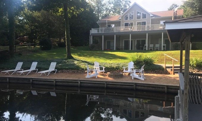 “Reel Livin’ at its best. This well-appointed, immaculate lake front home with large A-Frame windows (front and lakeside) will satisfy everyone's vacation needs. Large and quiet cove with deep water (7 feet at end of dock and 11-12 feet in center). With 4 bedrooms, 4 baths, and 2 living areas, there's plenty of space for everyone to relax and play. Main level has a well-equipped kitchen that opens to a spacious dining area (large table will accommodate 12 guests) and great room with TV and two comfortable sleeper sofas (Q). The master bedroom (K) with en-suite Jacuzzi bath and walk in shower, 2nd bedroom (Q) and additional full bath are also on the main level. Both bedrooms face the lake with sliding barn and glass doors for easy lake access. Lower level has a relaxing TV area, game room with an 8’ pool table and 4 captain’s chairs. In addition, the lower level offers a 2nd master bedroom (Q) with en-suite bath, a bunk room with 2 sets of double bunk beds (T) and pull down murphy bed (Q), full bath and laundry room with 2nd full sized refrigerator. As on the main level, both lower level bedrooms face the lake and have sliding glass doors. A large upper deck facing the lake is perfect for outdoor dining and entertaining. An outdoor dining table with seating for 6 and umbrella, gas fire pit with seating for 4, and 2 lounge chairs for sunning create the perfect setting for family gatherings. Let your evening entertaining continue on the lighted dock/boathouse deck and fire pit on the sandy beach area. Local attractions include Rosemont Winery and Tanglewood Shores Golf and Country Club, and Shady Shack Grill/Flip Flop Bar, all of which are just five minutes away. Need fishing tackle and bait? Want to take the kids for hand-dipped ice cream? Holly Grove Marina is a short drive or boat ride around the cove. No Pets. No Smoking. Home has Dish TV and free Wifi,. Gentle sloping lot to lake. Kayaks and paddle boat are available for use but renters assume all risk, liability, and responsibility. Property is located close to Interstate 85. A digital access code is required for entering the property.