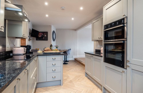 Breakfast bar with seating for four, double electric oven, ceramic hob, fridge, freezer, microwave, dishwasher, washing machine, Smart TV (account holders only), kettle, toaster and Nespresso coffee machine