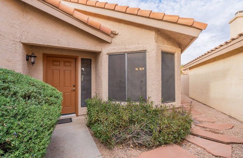 Located in a Tempe a few miles south of Phoenix, this quiet, two bedroom Tuscan style ranch is a private home on a dead end street with a green belt walking path steps from your door. The home has been recently remodeled including beautiful new tile floors, carpeting, furnishings and refinished kitchen cabinetry. The house has its own private backyard patio with a barbecue and your own orange tree. A community swimming pool and spa are available a short walk away. (Pool is unheated; spa is heated during holidays). The location is near world-class golf courses and most of the Spring training Cactus League sites are close by (5 sites are within 10-20 miles and remaining 5 within 30 to 45 miles). Wifi, smart TV with cable all included. There is a fully stocked kitchen for the cooking enthusiast or plenty of excellent restaurants nearby. ASU is a 10-15 minute drive down the street. Bedrooms sleep 4 comfortably, and you can sleep an additional two people on air-mattresses in the den which is off of the living room (with doors for privacy). The house is located in Tempe, 12 miles south of Phoenix Sky Harbor airport. Tempe Short Term Rental License #STR-000436