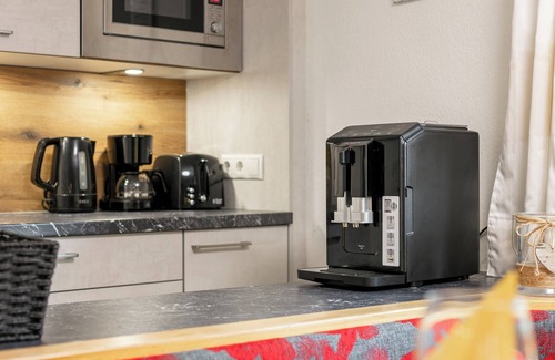 Ground floor: (Living room(TV(flatscreen, satellite)), Live-in kitchen(dining table, seating area, electric kettle, wood cooker, cooker(4 ring stoves, ceramic), hood, coffee machine(fully automatic), oven(electric), microwave, dishwasher, fridge-freezer), bedroom(double bed(180 x 200 cm)), bathroom(washbasin, shower, toilet), toilet)