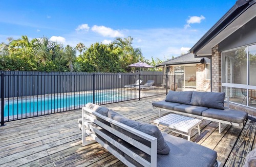 Step outside into your private outdoor oasis. The sparkling pool is complemented by two sun loungers and an umbrella, inviting you to relax under the Queensland sun. The outdoor space also includes a comfortable seating area with sofas, perfect for enjoying the lush backyard and unwinding after a day of adventure.