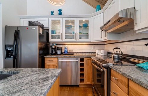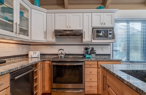 The updated kitchen features soft gray granite counters, stainless steel appliances, a deep sink, and pretty white cabinetry. Glass doors offer a glimpse into the well stocked cabinets. This is a chef's paradise - complete with a large pot for a low country shrimp boil! The island even has seating so you can enjoy company while you cook. The dining area is surrounded by windows allowing sunlight to stream. The rich wood dining table seats 6. The open floor plan allows a great flow of conversation between your family and friends. Barbecue on the gas grill stored under the home.