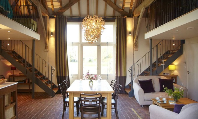 A blend of restored original features, and a carefully designed interior make this barn a really unusual and quirky place to stay! As you walk in you'll be surprised by height of the ceiling and the light playing through the funky lampshades... you'll see that downstairs Alma Barn is open plan incorporating a living room, dining area, fully equipped kitchen with a separate bathroom. Upstairs there are two mezzanine bedrooms, one with a double bed, the other with two twin beds. Lying in bed you'll get an amazing view of the incredible oak barn rafters and wind braces... enjoy the integrated Lutron light system with various settings, allowing you to regulate the mood. For the chillier times of the year, the Barn is kept lovely and warm by discrete underfloor heating which runs throughout.