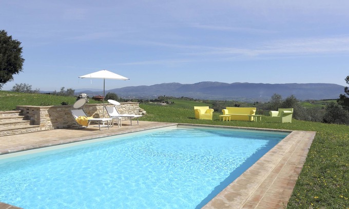 A modern restored villa just 10km from the medieval hilltop town of Todi. The villa has 5 bedrooms that can comfortably accomodate up to 10 guests. The house is surrounded by a countryside and a pine grove as well as a stunning view on the Umbria countryside. Dining room as well as a private swimming pool nicely furnished with lounge chairs for sun or shade.