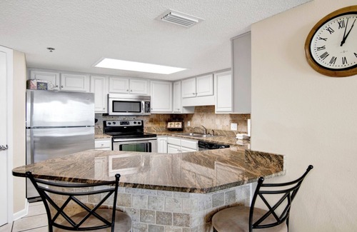 Step inside to find meticulously updated interiors boasting granite countertops, new furniture, and spacious living areas perfect for hosting pre-wedding gatherings. The master bedroom features a luxurious king-size bed and direct access to a private balcony overlooking the outdoor pool and beautiful Gulf waters. Guests can also enjoy two full-sized beds in the guest bedroom and a queen sleeper sofa, accommodating up to eight people comfortably. On-site amenities include a weight room, racquetball court, sauna, indoor and outdoor pools, hot tubs, tennis courts, and relaxing gazebo areas for barbecuing and unwinding after a busy day of wedding activities.