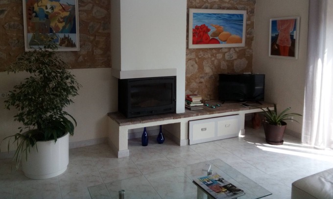 The house is composed of a spacious, bright and cozy 32 m2 living room with a fireplace and a dining space, it has a convertible sofa that can be used by a third guest. It communicates with a large open-plan kitchen with an island and a terrace equipped with a summer lounge to enjoy the freshness of the mornings at breakfast, and the tranquility of the sunset with aperitifs, or also savor moments of rest. The bedroom with a relaxing atmosphere, is equipped with a double bed and a large wardrobe, with sheets available to guests, and has direct access to the terrace. A complete bathroom with a hydromassage bathtub and a built-in shower, a toilet and furniture with 2 sinks, is equipped with a hairdryer and a set of towels.