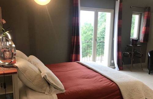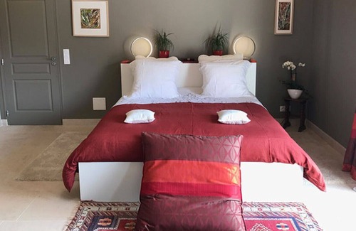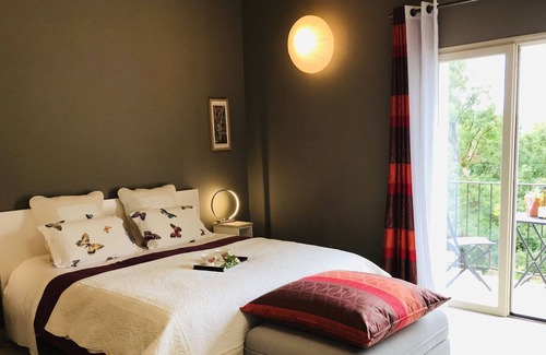 Loft spirit and neat decoration. This vast suite (48 m2), loft spirit is declined in taupe beige with its high ceiling in white poplar and slabs of Burgundy on the ground. You will sleep in bedding 180/200 comfort, the bathroom with bath and shower polished concrete is open to the room, separate toilet. The balcony to the south and the terrace to the south west guarantee sun all day and for your pleasure: flat screen television and nespresso. Private parking. Independent entrance. Our animal friends are not accepted. All our rooms are non-smoking.