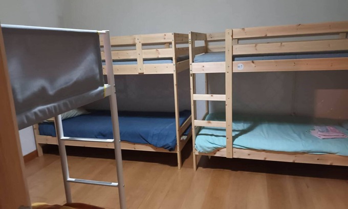 Step into our imaginatively transformed 6-bed dormitory room, where comfort meets creativity in every corner. Each bunk bed is designed to provide a snug and restful sleep experience for all six guests, ensuring a cozy retreat after a day of adventure. The inviting wood floor exudes warmth and charm, setting the tone for a relaxing stay.