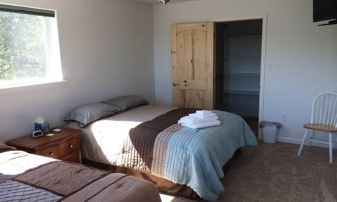 This bedroom has two queen beds, a walk-in closet with hangers, and a shared bathroom (right outside next to the bedroom). Share this bathroom with another bedroom (Cozy Bear room). The room doesn't have a television. No continental breakfast provided.