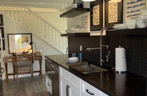 New guest home, private parking (2) designer interior, new stainless kitchen, microwave, dishwasher, stove with oven. Full sized washer dryer, great high speed internet, screened porch on its own pond.