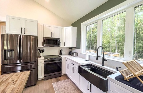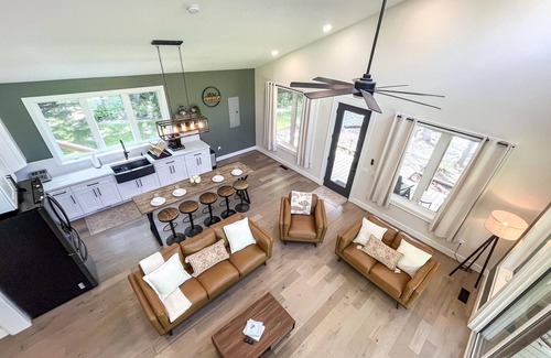 The large, gourmet style kitchen is fully stocked so that you can prepare a full meal. The main room with cathedral ceilings and numerous windows brings in plenty of natural light and offers a nice view of the property.