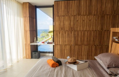 The bedroom and the bathroom merge into one big space, open on the sea thanks to large bay windows that can disappear in the walls of the villa.