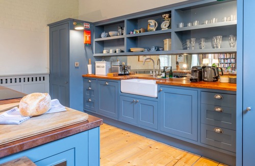 Beneath the Hayloft, The Stables is a contemporary conversion entirely on the ground floor. Here, the space has been tastefully converted into a stylish studio-style retreat and sleeps up to two guests in one bedroom. There is a large, open-plan living space including a well-equipped, bespoke kitchen with a large island and a dining area for up to four guests so friends are most welcome to join you for a home-cooked supper. For a cosy night in, the two Chesterfield sofas are conveniently positioned for enjoying a film or two on the 55" Smart television. Accessed from the sitting area via sliding wooden panel doors, the bedroom hosts a generous 6' super-king size bed and benefits from an en-suite bathroom with freestanding bath, Jack and Jill basins, and a 'loo with a view'.