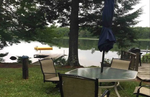 3-bedroom cottage nestled in a quiet cove just steps from the water. Private mooring and pier. A favorite lake for boating, ice fishing, swimming, sailing or just enjoying the abundant natural beauty and wildlife of the local area. Park-like setting. All natural pine walls and cathedral ceilings. Fully equipped kitchen, outdoor gas grill. Canoe, kayaks provided.