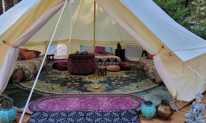 Bell Tent at Bigfoot Lodging in the woods with majestic tall pine trees close to Lassen Volcanic National Park. There is a queen size bed with a memory foam mattress and two twin beds inside the Bell Tent. There's also a lake and a creek on the property where you can relax in the natural and peaceful wooded setting.