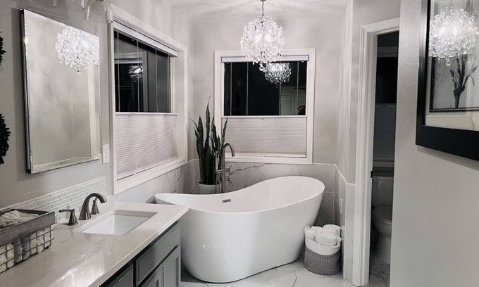 • Main suite with a king bed, large walk-in closet, and spectacular ensuite bathroom featuring a stunning upright tub under a crystal chandelier.