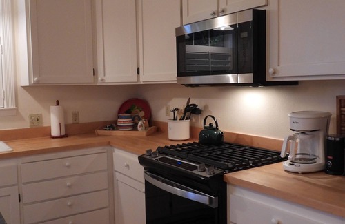 Our 1900's restored Victorian home offers the charm of a classic era, as well as modern comforts and conveniences. Located on a quiet cul-de-sac, the warmth of style and decor of this two-story wine country beauty will enhance your stay in the heart of the Napa Valley, St. Helena. With hardwood floors, designer rugs, recessed lighting and vaulted ceilings, the living room offers cozy seating around the fireplace. An open floor plan makes this home comfortable for up to 6 persons. Owned by a local chef, Bella Notte's bright and open kitchen is perfectly styled and fully equipped. With seating in the kitchen at the central island and adjacent dining area you will enjoy preparing meals, while sipping wine and visiting with friends. Everything you will need to make your favorite meal awaits you in this kitchen. The kitchen features a full-sized gas range, oven and microwave..