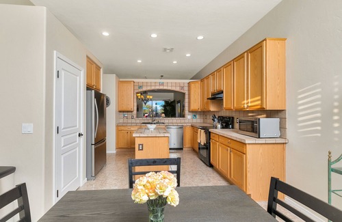 You will enjoy the private backyard with pool (heating available), a spa that is always hot and ready to use, lounge chairs by the pool, new gas BBQ, and a covered patio with a dining table and seating for six. The wrought iron fence provides open views to the adjacent natural desert landscape. The feel of wide open spaces will accent your vacation and make some memorable moments for you to cherish for a long time to come.