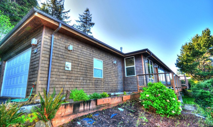 Bella Vista, Italian for Beautiful View. Bella Vista has spectacular views of Yachats, the bay and ocean. This upscale home is on one of several hillside neighborhoods that make Yachats the charming seaside village it is. A short walk to the Yachats wayside park for strolling along the sandy bay. Also just a short distance to the heart of the village with quaint shops and great restaurants, not to mention the friendliest and laid back atmosphere. This home offers one bedroom with a king bed, and a second bedroom with a queen bed. There is also a sofa that pulls out into a sleeper sofa. Come see why people fall in love with the village and you will fall in love with Bella Vista and make it your "Home at the Coast" for years to come.