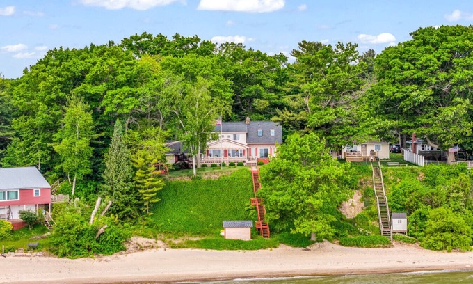 Welcome to your dreamy lakefront escape, Bella's Bluff. Perched on a bluff with private stairs leading down to a sandy private beach, this 3-bedroom, 2-bathroom retreat is packed with cozy charm and all the chill you’re craving. Spend the day sunbathing, swimming, or skipping rocks right outside your door. Sip coffee with sunrise views, soak in the hot tub under the stars, and stretch out in the open-concept living space. With bunk beds for the kids, a sleeper sofa for extra guests, and lake views from nearly every corner, this is the kind of place that makes you forget what day it is.
