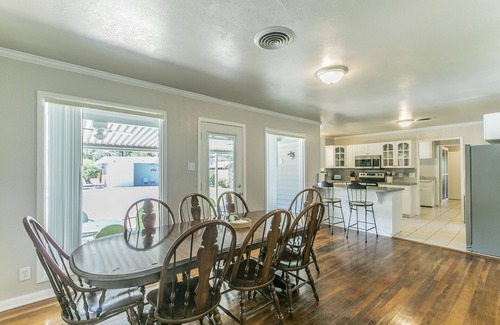 The “Belle of Belton” is a vacation rental in Belton, Texas on about a ½ acre lot within the picturesque Norman Place Subdivision. This lovely home is situated just a few minutes from the historic downtown area where visitors can enjoy fabulous dining, shopping and walk or bike the paved trails of Nolan Creek. The Belle is in close proximity to Chalk Ridge Falls - a must for nature lovers and hikers. The home is about 6 miles to scenic Lake Belton. The Belle, built in 1956, celebrates the uniqueness of the 50’s with stunning hardwood floors and large, plentiful windows. The home boasts approximately 3000 square feet, 4 comfortable bedrooms with 2 and two ½ baths, an amazing living room, a perfect game room, an extensive covered back patio, and a dream backyard with a pool, hot tub and shower house. The kitchen features upgraded appliances and seating in dining areas provide plenty of room for large families. In addition to central air conditioning, guests are treated to zone control air conditioning in both king bedrooms and game room. Please note that if the dates you are seeking are not available at this location, you might want to check out our other VRBO just down the street called “Ginger House”. It’s really nice too,  and has a game room, swimming, pool, and hot tub as well.
