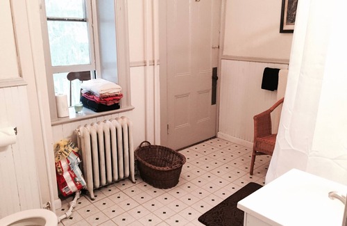 Private apt high ceilings, great views, balcony & furnished with antique furniture. Set in Victorian Bellefonte easy walk to bars, cafe's, & parks. 10-15 min drive to State college/ PSU. One full bed, couch, Futon, and queen inflatable mattress. Large living room with futon and vintage couch. Kitchen w/ basic pots, pans, fridge, and small apt stove/oven. Clawfoot bathub in bathroom w/ balcony that connects to large bedroom. High speed wifi included. There is AC in bedroom and a fan in the living room/ kitchen area.