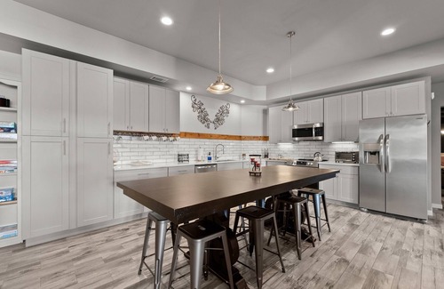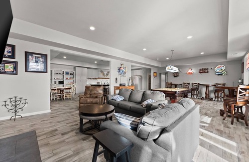This property offers 2 separate full kitchens, one on the main floor and another in the full daylight basement that is perfect for a large group. The kitchen is loaded with pretty much anything a chef would need! There is a beverage refrigerator and ice machine on the main level for your convenience. The screened in porch has beautiful views of the lake with an additional eating and relaxing area with a TV for your enjoyment. You will be able to experience your time on the lake with your own private double deck dock, pool, and hot tub. This private lakefront property sits on almost 9 acres with stunning views of the lake. The large backyard is fenced in. The basement has a theatre room, pool table, and a poker table. There is a small room off to the side set up for kids to play video games. There are a variety of board games for children and adults. There are several kayaks and paddle boards available to rent.