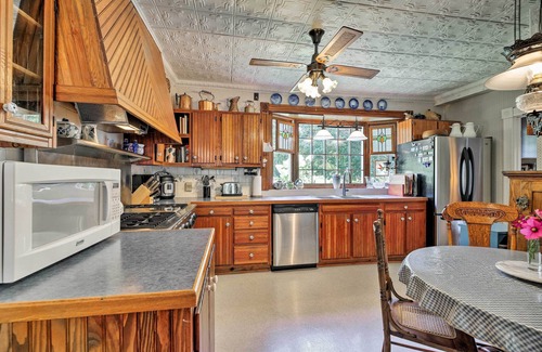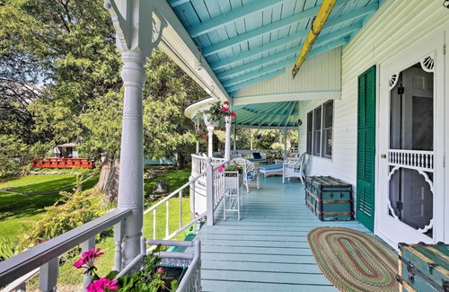 The main house features 6 private bedrooms, a large wraparound porch with an outdoor dining area and waterfront views, plus a charming sun porch. The eat-in kitchen is fully equipped with stainless steel, commercial-sized appliances and a convenient dishwasher. Fire up the crock pot to cook with ease! Inside the main house is where you'll find a wood-burning fireplace, a washer and dryer, A/C window units on the third floor, and a flat-screen TV.