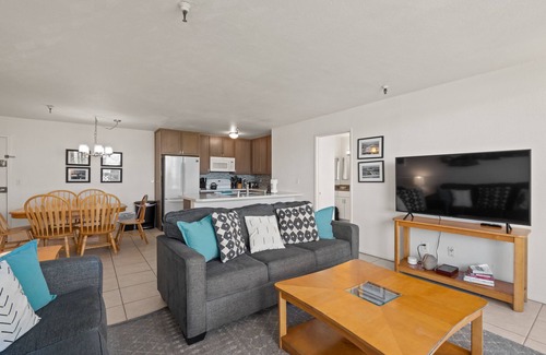 Inside, the open-concept living, dining, and kitchen area welcomes you with comfortable furnishings, floor-to-ceiling windows, and beachy vibes throughout. A fully stocked kitchen and cozy living room make relaxing a breeze after a day of seaside adventures. Both bedrooms feature private ensuite bathrooms and generous closet space, offering comfort and privacy for your group.