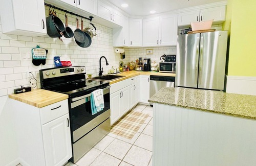 We will happily stock the refrigerator before you check-in by picking up your pre-paid curbside groceries and putting everything in place. Simply place your order for pickup the day before check in, and message me with the confirmation details. You're going to love the updated kitchen, with butcher block counter tops, farmhouse table, and rolling granite topped island. We include a variety of breakfast items for your convenience (flavored oatmeal, cold cereal, coffee, tea, and more seasonally). Help yourself to coffee/sugar/sugar substitute/creamer, tea, and a variety of pantry and breakfast items. You will find a wide a variety of pots, pans, roasting pans, electric griddle, blender, slow cooker, ice cream maker, 12 cup coffee maker, French press, milk frother, utensils, and more!