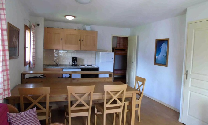 Accommodation: Apartment 3 PIECES + COIN NUIT 8 people of 47m2 located in Valfréjus Residence Busseroles - Le Belvedere 300m from the cable car of Arrondaz, shops and ski schools.Location: Ground floor without elevator. West facing balcony, view of the Vanoise Park.Composition of the apartment : - Kitchen corner equipped: electric hobs 4 heat, refrigerator with freezer, oven, dishwasher, microwave, filter coffee maker, kettle, toaster- Living room with TV- Bathroom with shower, washbasin and toiletSleeping: - Master suite with 1 double bed (140x190cm) + window, bathroom bath, sink and toilet- Bedroom with 2 single beds (80x190cm) + window- Night corner in the entrance with bunk beds (2 single beds 80x190cm)- Dusky sofa (2 single beds 80x190) in the living room- Duvets, Covers, Rectangular Pillows- DRAPS INCLUSIVE (*)Miscellaneous : Vacuum cleaner, Ski boxADDITIONAL INFORMATION:Tourist tax: according to the applicable rate to be paid on siteCautions: 500 euros for housing and 100 euros for the household. Bonds are to be paid on the spot by credit cardFree outdoor parking on the station ADDITIONAL BENEFITS : Rates and reservations at the rental agency- Covered parking : 40 euros / week - HIVER : ski pass, ski lessons, ski equipment discount code, towel, cleaning end of stay, baby bed rental, baby chair, toboggan...- ETE : Pass activities, towel, cleaning end of stay, baby bed rental, baby chair... NON-ADMITTED ANIMALS - PROFESSIONAL ANNOUNCEMENTMOBILITY REDUCED : this apartment is not suitable for people with reduced mobility(*) condition for direct customer
