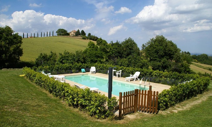This wonderful 3-bedroom holiday home is set in Treia, in the wonderful countryside of Le Marche. You have a furnished private terrace and a swimming pool with sun-loungers to have a pleasant holiday. The holiday home is ideal for a family or a group of 7 persons. The holiday home is situated in a unique location, with plenty of cultures to enjoy. Restaurants serving local dishes are 1 km, while supermarkets are 6 km away from the home. You can wander through the splendid medieval streets in the lovely city of Macerata, 23 km away. You can spend a day at the beach in the town of Porto Recanati, 40 km away. The holiday home has a central heating facility. In the living room, you can get cozy around the fireplace and watch movies on the TV. The large kitchen has an oven to bake cakes and pizzas. You have a shared garden to enjoy lazy walks at night and relax sitting in the garden furniture. For little guests, you can request a cot for free.