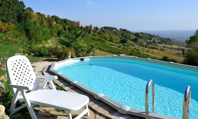Book this apartment in a nice country house with magical scenery and hills for as far as you can see, a shared swimming pool to enjoy a refreshing dive, and a garden with furniture to unwind and set up a barbeque grill. A family with kids or a group of friends is welcome to stay in this apartment.