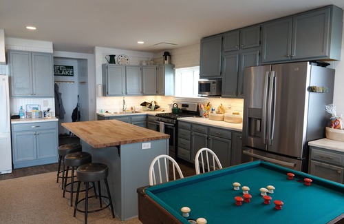 The fully-stocked open kitchen/dining area offers all of the cooking and food prep equipment and space you would need. Our two indoor dining tables seat up-to 14. The dock offers easy access to fishing and swimming, and an open boat slip with pilings for docking your boat. There is plenty of outdoor furniture, including an outdoor dining table with umbrella, adirondack deck chairs, a full hammock, and a single swing hammock. The summer game bungalow is one of our renters’ favorites – a place to escape to play foosball, darts, or one of the many board games stocked in the cottage. The game bungalow is a perfect bedroom/retreat for pre-teens or teens during their vacation. We keep the house stocked with lawn games and Schwinn cruiser bikes for our renters to use also.
