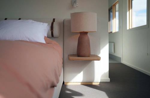 During the warmer months, take a refreshing dip in the solar-heated swimming pool, where the stunning views only enhance the experience. The ocre rammed earth walls and timber accents throughout the retreat add to its rustic charm, while modern amenities such as board games, karaoke, and a coffee maker ensure that every moment is filled with joy and relaxation.