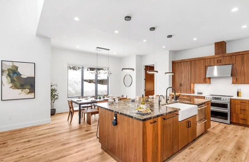 Stay + play at Berghaus. This professionally designed 4BR/4BA new-build is warm + luxurious, + the LOCATION is unbeatable! SKI IN/OUT to the Poma, on Morel Trail w/ quick access to USFS, + < a mile to the Village, golf course, Lodge + Arling Center wedding venues. Lovely blend of indoor/outdoor space w/ plenty of room for skis + bikes--game room with kids area, 2 car attached garage, mudroom, large laundry room, multiple balconies, + spacious fenced yard w/ private hot tub.