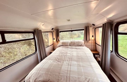 Bertie is our lovely converted cosy 3-bedroom bus, set in an amazing, peaceful, elevated location with great field views. He has mains electricity, water, a fully equipped kitchen, with a small oven & fridge. A sitting room with fire, and a dining table for 8!