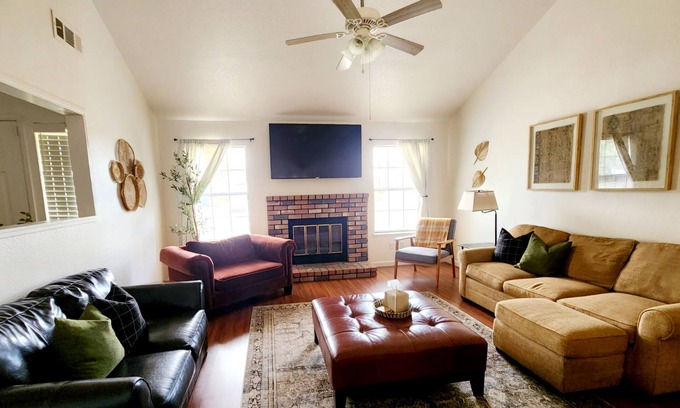 You are invited to stay at our cozy home. Where you'll have many options for fast food chains, restaurants, and much needed retail therapy "sessions," and more, all within a 5 minute drive! Our Home has been furnished and supplied with you in mind. Enjoy our cozy furniture indoors with a TV in each room; or enjoy our back patio while you BBQ where we've added an extra TV for you, so you can catch up on your shows or watch the game!