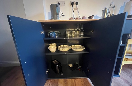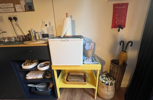 Sideboard with toaster, kettle, Nespresso coffee ,, mini fridge, water, milk and snacks for you to enjoy, and hairdryer too