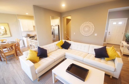 Come enjoy a brand new, carefully decorated 4-bedroom townhouse. Snuggle by the fireplace with a book, jam to the vintage jukebox or test your skills with vintage pinball or ping-pong. Barbeque in the fenced back yard and prepare your feast in the fully-stocked kitchen.