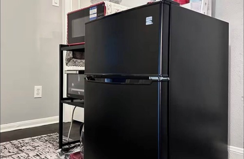 In the hallway, you’ll find a mini fridge with freezer, stocked with complimentary water and soda . We also provide an electric kettle, microwave, air fryer and stove for your convenience