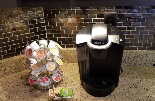 Coffee with assortment of Keurig K-cups, cream and sweeteners.