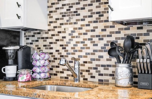 • A full kitchen with stainless steel appliances, complete coffee bar, wine/champagne glasses, pots, pans, utensils, and fabulous dishware (yes, there’s a corkscrew!)