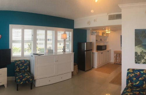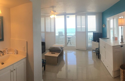 Our unit #424 is a great studio for a vacation. A queen bed and cabinet bed sleep 4. The 17' wide balcony offers a 270 degree unobstructed view of the southeast exposure with water as far as the eye can see! Gorgeous sunrises! It also overlooks the famous Tiki bar restaurant and the pool. 50" Smart flat screen TV with internet. Wonderful Italian restaurant (Casa Calabria) with lively piano bar singing Italian songs, real estate office, hair dresser, a clothing and convenience store and a coffee bar open 24/7 are all on the lobby floor of the building. Valet parking only. Short walking distance to many stores & restaurants, including Winn Dixie, a liquor store, a dry cleaners, CVS, a hair salon, Holy Cross Medical Group, Dunkin', McDonald's, pizza cafe, great New York deli and a large souvenir shop selling everything you need for the beach! Jet Ski, kayak, & paddle board rentals next door. Check in 3:00 pm/Check out 11:00 am.