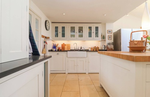 Heating with wood-burning stove. Electric double oven, four ring ceramic hob, fridge/freezer, washing machine, dishwasher. 2 x TV, WiFi. Bed linen and towels inc. in rent. Enclosed walled garden with patio and furniture. One well behaved dog welcome. Sorry, no smoking. Shop 0.4 miles, pub 0.1 mile. Note: This property cannot accept Sunday arrivals.