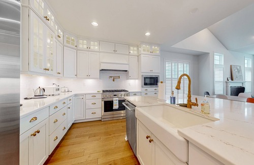 The open gourmet kitchen, with golden accents throughout, adds a luxury touch to the space. Stainless steel appliances make cooking and baking a breeze. Kitchen professional exhaust vents are powerful, helping to keep guests comfortable while using the kitchen.