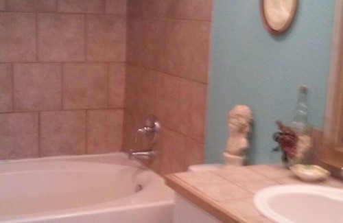 Bathroom has shower, garden tub combination.