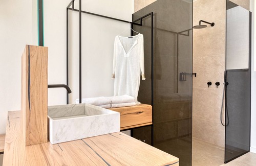 BETA VILLA (accommodates up to 6 persons). Not recommended for kids under 10 years old. The 80sq interior is composed of 3 bedrooms (double beds), 2 bathrooms, 1 ensuite, accommodating up to 6 visitors. The open plan living-dining area and the fully equipped kitchen looks directly through wide windows- from floor to ceiling - the pool terrace and sea view. At the 170sq terrace, the visitors can enjoy the private swimming pool all day and night and all the daily meals in the dining area. Help yourselves to a glass of wine or a cocktail drink and enjoy the sunset next to the pool.