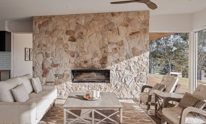 The large open plan living area features comfortable couches surrounding a wood fire built into the stone feature wall as well as a huge camphor-laurel dining table that adjoins the space with seating for 10.